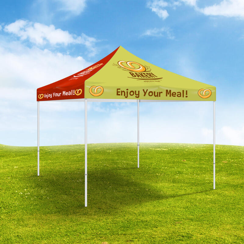 | UV ink, 7.9oz water-repellent fabric. Tents include 4 fabric panels and can feature up to 4 different designs (one for each side) |